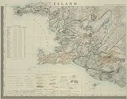 Björn's survey formed the basis of many subsequent maps of Iceland for the next hundred years; new maps based on new surveys appeared only after World War II.[15] It was an immense work, and Björn realized soon enough that one man alone would not be able to triangulate the whole island in his lifetime, and focused his attention on the inhabited areas. Yet he managed to survey a good part of the wilderness, too, even if he had to rely on the accounts of the local population in some remote areas. Björn was well aware of the inaccuracies in some regions; already in 1834, he wrote that one "should neither have too high or too low expectations of the map, nor trust too greatly nor too little in its usefulness or accuracy".[16] The central highlands were sketchy on his map; they were mapped properly for the first time by Þorvaldur Thoroddsen, whose map was printed in 1901. Still, Björn's survey is considered a great advancement, especially given the limited resources he had at his disposition.[15] In recognition of his outstanding survey work Björn Gunnlaugsson was awarded the Knight's Cross of the Order of the Dannebrog in 1846 and also received the Knight's cross of the French Légion d'honneur.[17] The map was also exhibited at the World's fair at Paris in 1878, where it was awarded a prize.[18]