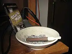 A plastic tipped Black & Mild in an ashtray, with package in background