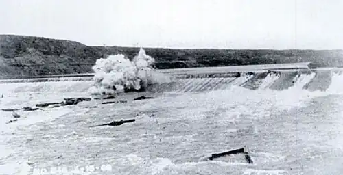 On April 14, 1908, at about 2:30 PM, Hauser Dam—a steel dam about 90 miles upstream from Great Falls— failed.[57] A surge of water 25 feet (7.6 m) to 30 feet (9.1 m) high swept downstream.[58] A Great Northern Railway locomotive was dispatched to the city of Great Falls, warning stations along the way about the dam break.[59] Workers at the Boston and Montana Smelter in Great Falls improvised a wing dam to deflect the floodwaters away from the smelter site and dynamited a portion of Black Eagle Dam to allow the floodwaters to go downstream.[8][60][61] Their efforts were not needed, as the Missouri River only rose 7 feet (2.1 m) by the time it reached that city.[62] Two deaths occurred while the dynamiting attempt was made, however: One man drowned while trying to remove flashboards from the dam, and another drowned when his boat capsized.[8][61]