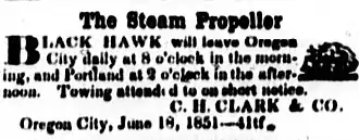 By June 26, 1851, the boat's management, C.H. Clark & Co., were advertising more specific departure times, 8:00 a.m. from Oregon City, and 2:00 p.m. from Portland, with towing "attended to on short notice."[13]