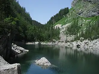 Black Lake (Slovene: Črno jezero) (1,319 metres or 4,327 feet) is the lowest-lying lake in the Triglav Lakes Valley, part of the Julian Alps in Slovenia. It is named for its location in a basin in the middle of the forest, which stretches right to the edge of the Komarča rock face. Because of its relatively low elevation, it is the warmest of the Triglav Lakes. At the surface, its temperature in summer is 9 °C (48 °F), whereas in winter it is 3 °C (37 °F). It is 150 m (490 ft) long, 80 m (260 ft) wide, and up to 6 m (20 ft) deep.[1] The Alpine Newt (Ichthyosaura alpestris), endemic to the Alps, lives in it.