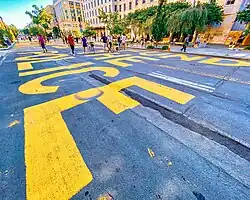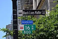 Black Lives Matter Plaza (officially Black Lives Matter Plaza Northwest) was a two-block-long pedestrian section of 16th Street NW in downtown Washington, D.C.[2][3] The plaza was renamed by Mayor Muriel Bowser on June 5, 2020, after the D.C. Department of Public Works painted the words "Black Lives Matter" in yellow, 35-foot-tall (11 m) capital letters, along with the D.C. flag, during the series of George Floyd protests taking place in the city.[4][5][6]