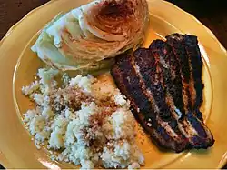 Blackening is a cooking technique used in the preparation of fish and other foods. Often associated with Cajun cuisine, this technique was invented and popularized by chef Paul Prudhomme.[1] The food is dipped in melted butter and then sprinkled with a mixture of herbs and spices, usually some combination of thyme, oregano, chili pepper, peppercorns, salt, garlic powder, and onion powder.[2] It is then cooked in a very hot cast-iron skillet.[2][3] The characteristic brown-black color of the crust results from a combination of browned milk solids from the butter and charred spices.[4]