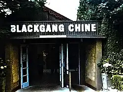 According to a May 2000 talk to the Isle of Wight Postcard Club by the then director, Mr Simon Dabell, the etymology is simply "black pathway" (the original appearance of the chine),[4] but the theme park understandably fosters the interpretation of a smuggling origin. Thus visitors to the park are greeted by a gigantic fibreglass statue of a smuggler between whose legs they could pass to enter.[5]