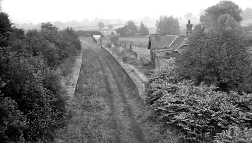 A line from Greens Norton junction near Towcester to Stratford-upon-Avon and the junction with the Great Western Railway's Honeybourne branch line was first authorised in June 1864, but due to a lack of funds it took a further nine years for the line, built by the East and West Junction Railway, to be fully open to traffic.[3] A station was opened at Blakesley, a Northamptonshire village 8+12 miles (13.7 km) from Blisworth, with two platforms enclosing the running line as well as a loop line which also served as a goods siding. A signal box was located between the east end of the down platform and the loading dock, and to the west a road overbridge carried Blakesley High Street over the line. The station buildings, a one-storey brick building, were demolished by 1952 leaving the station as little more than a halt.[4] Passenger services were withdrawn later that year, with goods continuing for a further ten years.