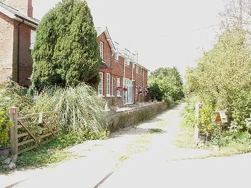 Parliamentary authority to extend the Wycombe Railway's single track line beyond Princes Risborough to Oxford was given on 28 June 1861.[4] Thame was reached by 31 July 1862 and a regular service from Paddington via Maidenhead began the next day. Four daily trains each way (one on Sundays) called at Thame, Bledlow, Princes Risborough, West Wycombe, High Wycombe and Maidenhead.[5] Bledlow station was west of a level crossing on Sandpit Lane, 1 mile (1.6 km) from the village from which it took its name. A two-storey brick station building was built at Bledlow at a cost of £1,003-13s-6d.[6] It included a booking office and accommodation for the station master.