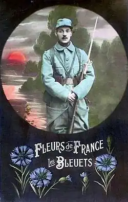 At the same time, the term "bleuets" was used also to refer to the class of conscripted soldiers born in 1897 who arrived in the lead-up to the Second Battle of the Aisne, because of the bleu horizon worn by French soldiers after 1915. The uniform worn by these recruits, many of whom were not even twenty years old, was distinctive because it marked a break from the pantalon rouge trousers worn by older soldiers, which were part of the standard uniform before the First World War.[2]