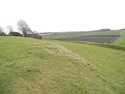 The rampart was built a considerable time later than the original timber palisade that defended the early settlement.[8] The rampart was originally 6.4 metres (21 ft) wide, with a 4 metres (13 ft) gap between the inner and outer retaining timber supports.[9] The rampart was built from chalk packed firmly between the timber retainers.[10] The second phase of the rampart was of the "Low Dump" type, with an asymmetrical cross-section and a shallow incline towards the rear, with a much steeper front dropping directly into the ditch.[11] This replaced the earlier filled-timber wall-and-fill style of rampart.[12] In the eastern part of the hillfort, the rampart has been badly damaged by ploughing, and in places destroyed. In the western portion, part of the rampart survives as a sunken lynchet, and the ditch there survives as a flat terrace.[2] In the first phase of the rampart, the ditch was approximately 1.5 metres (5 ft), but when it was recut for the second phase it was deepened to 4.6 metres (15 ft).[2] The hill features a number of unusual terraces or lynchets, the age and function of which is unknown, although they are believed to post-date the Iron Age.[2]