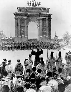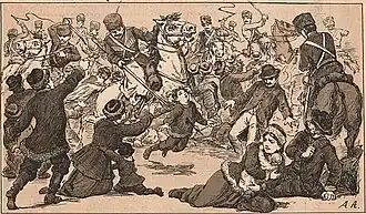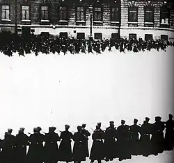 As late as 2 pm large family groups were promenading on the Nevsky Prospekt as was customary on Sunday afternoons, mostly unaware of the extent of the violence elsewhere in the city. Amongst them were parties of workers still making their way to the Winter Palace as originally intended by Gapon. A detachment of the Preobrazhensky Guards, previously stationed in the Palace Square where about 2,300 soldiers were being held in reserve, now made its way onto the Nevsky and formed two ranks opposite the Alexander Gardens. Following a single shouted warning a bugle sounded and four volleys were fired into the panicked crowd, many of whom had not been participants in the organized marches.[24]