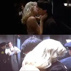 Despite Blue Velvet's initial appearance as a mystery, the film operates on a number of thematic levels. The film owes a large debt to 1950s film noir, containing and exploring such conventions as the femme fatale (Dorothy Vallens), a seemingly unstoppable villain (Frank Booth) and the questionable moral outlook of the hero (Jeffrey Beaumont), as well as its unusual use of shadowy, sometimes dark cinematography.[35] Blue Velvet establishes Lynch's famous "askew vision"[36] and introduces several common elements of his work, some of which would later become his trademarks, including distorted characters, a polarized world and debilitating damage to the skull or brain. Perhaps the most significant Lynchian trademark in the film is the unearthing of a dark underbelly in a seemingly idealized small town;[37] Jeffrey even proclaims in the film that he is "seeing something that was always hidden". Lynch's characterization of films, symbols and motifs have become well known and his particular style, characterised largely in Blue Velvet for the first time, has been written about extensively using descriptions like "dreamlike",[38] "ultraweird",[39] "dark",[40] and "oddball".[41] Red curtains also appear in key scenes, specifically in Dorothy's apartment and at the night club where she sings, which have since become a Lynch trademark. The film has been compared to Alfred Hitchcock's Psycho (1960) because of its stark treatment of evil and mental illness.[42] The premise of both films is curiosity, leading to an investigation that draws the lead characters into a hidden, voyeuristic underworld of crime.[43]