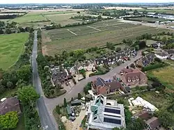 Current state of Blunham Railway Station (light coloured building). Taken from the air - August 2025