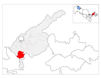 Boʻka District is a district of Tashkent Region in Uzbekistan. The capital lies at the city Boʻka.[1] It has an area of 590 km2 (230 sq mi)[2] and it had 127,500 inhabitants in 2021.[3] The district consists of one city (Boʻka) and 8 rural communities (Iftixor, Qoraqoʻyli, Turon, Koʻkorol, Qoʻshtepa, Namuna, Rovot, Chigʻatoy).[1]