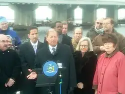 Within weeks of taking office, Turner was attacked by the Democratic Congressional Campaign Committee (DCCC) for his no new tax pledge, and painted by the DCCC as representing wealthy individuals and corporations rather than the average district voter.[48] Turner expressed support for hydrofracking in upstate New York, and would allow states to opt out of No Child Left Behind.[49] Remarking on the tenth anniversary of the war in Afghanistan, Turner said he would "leave our military commitment in Afghanistan up to the generals in the field," adding that, "If they believe the sacrifice of our soldiers continues to be necessary to prevent attacks on U.S. soil, then we have no choice but to let them finish the task."[50] Turner was an advocate for removing the tolls on the Cross Bay Veterans Memorial Bridge, and applauded Gov. Cuomo for his motions towards changing the policy.[51]