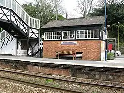 The former signal box, which now houses a cafe, is situated to the north-east of the booking office, with the footbridge lying beyond this. The signal box is a Great Western Railway Type 3 structure dating from 1887 with stairs in two different styles. It was designated as a Grade II listed building in 2015.[17]