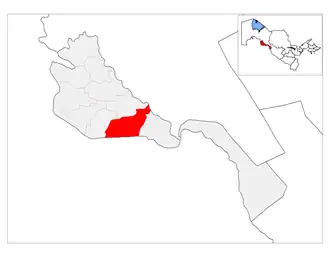 Bogʻot District (Uzbek: Bogʻot tumani, Боғот тумани, باغات تومنى) or Bagat District is a district of Xorazm Region in Uzbekistan. The capital lies at the town Bogʻot.[1] It has an area of 440 km2 (170 sq mi)[2] and it had about 200,000 inhabitants in 2024. [3] The district consists of 5 urban-type settlements (Bogʻot, Madaniyat, Nurafshon, Oltinqum, Uzumzor, Yangiqadam) and 10 rural communities. The meaning of the word "Bog'ot" comes from two words: "Bog'", which means garden, and "at", which means "to do" in the local language. Which makes sense as create a garden.[1]
