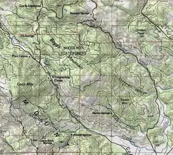 The 3,453 acres (1,397 ha) Boggs Mountain Demonstration State Forest covers the relatively flat top of Boggs Mountain.[21] The California Department of Forestry and Fire Protection (CAL FIRE) purchased the land in 1949.[22] The state bought the land for just $38,700 because it held no timber of commercial value.[18] The 200 acres (81 ha) Boggs Mountain Inner Coast Range Reserve has steeper slopes that have virtually undisturbed vegetation. It is under a conservation easement with the Napa County Land Trust.[23] The Valley Fire of 6 October 2015 burned many of the trees on the mountain.[7]