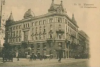 The luxurious tenement house was designed by the Warsaw architect Józef Huss. Sales took place on the ground floor and the first floor, the second floor was occupied by the owners, the third floor was rented out to tenants, and the fourth floor was used for tailoring clothing. The assortment was greatly influenced by Bogusław Maciej Herse's wife, Filipina z Kotków (1842–1925). In 1926, the building was significantly damaged by a fire. It was one of the first Polish companies to utilize advertising power, buying full-page ads, publishing a seasonal catalog of merchandise, and organizing fashion shows, with one of the models being Stefania Grodzieńska. In 1936, the company ceased making clothes. By the end of the interwar period, the building housed, among other things, the Polish-American Chamber of Commerce.[3][4]