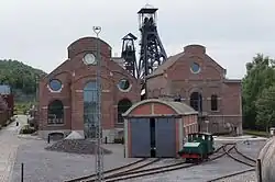 The history of coal mining on the site of the Bois du Cazier dates back to a concession awarded by royal decree on 30 September 1822; a transcription error caused the name of the site to be changed from Bois de Cazier. After 1898, the site was owned by the charbonnages d'Amercœur company and operated by the Société anonyme du Charbonnage du Bois du Cazier. The site had two mine shafts reaching 765 metres (2,510 ft) and 1,035 metres (3,396 ft) deep. A third shaft, known as the Foraky shaft, was begun in the mid-1950s. By 1955, the mine produced 170,557 tonnes (167,863 long tons; 188,007 short tons) of coal annually and employed a total of 779 workers, many of whom were not Belgian but migrant workers from Italy and elsewhere. They were housed by the mining companies, which in reality meant they moved into Nissen huts in former prisoner of war camps in the region. On 8 August 1956, a major mining accident occurred and a fire destroyed the mine; 262 workers of 12 nationalities were killed. In the aftermath of the disaster, Italian immigration stopped and mining safety regulations were revised all across Europe and a Mines Safety Commission established.[2] Full production at the Bois du Cazier resumed the following year.[3] The company was liquidated in January 1961 and the mine finally closed in December 1967.[1] It was listed as a national monument on 28 May 1990 and opened as a museum in 2002.[3]