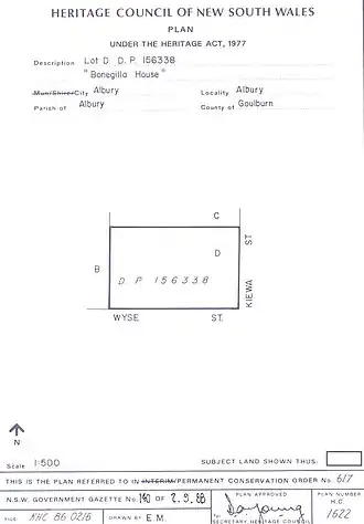 1. ^ a b "Bonegilla House". New South Wales State Heritage Register. Department of Planning & Environment. H00617. Retrieved 28 May 2018. Text is licensed by State of New South Wales (Department of Planning and Environment) under CC BY 4.0 licence.