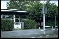 Bonn American High School's main entrance at 14 Martin Luther King, Jr Strasse. The school sign, replaced in the early 1980s, was designed by Dave Jessop, Class of 1982.