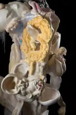 Between 2000–07, in exhibitions such as "In the Gutter" (Lehmann Maupin, 2000) and "Rebel Angel" (Susan Inglett, 2003), Collura experimented with increasingly abstracted, monochrome sculptures.[5][40][4][30] They melded barely recognizable human and animal forms, branches, classical drapery and commedia dell'arte costuming, seemingly embattled to materialize out of central, amorphous masses (e.g., Chain Reaction, 1999).[5][41][6][4] Reviewers characterized these works as "dramatically abject"[6] portrayals of ecstasy or distress that suggested souls entrapped in terrestrial chaos or angels expelled into corporeality as monsters and twisted freaks of nature.[4][30] New York Times critic Holland Cotter likened them to "multi-vehicle collisions ... Baroque sculpture, Disney animation and Butler's Lives of the Saints seem to have met at meltdown speed, leaving stray limbs and maimed myths protruding from the wreckage."[35] Guardian (2003) portrayed a 21st-century Madonna with a clown's nose and an erupting hand, while Death of a Virgin (2006–11) depicted a large-eared, shattered figure on its back atop a vertical mass, as if after a great fall.[29][30]