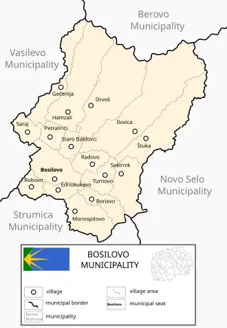 The municipality comprises 16 villages: Borievo, Bosilovo, Gečerlija, Drvoš, Ednokukjevo, Ilovica, Monospitovo, Petralinci, Radovo, Robovo, Saraj, Sekirnik, Staro Baldovci, Turnovo, Hamzali and Štuka.
