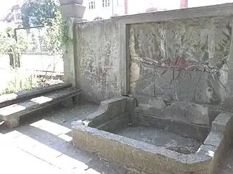 Among the built structures, one can notice stone arches, pergolas, and a small courtyard showing on its centre a sundial, with four stone sculptures (1.5 metres (4.9 ft) tall) standing in corners, portraying the seasons. This allegoric ensemble, called The four parts of the year, was in the initial 1930's botanic garden lay out, offered by Polish sculptor Bronisław Kłobucki (1896-1944).[7] They have been lost, together with the sundial, when the new botanic garden at Myślęcinek opened in 1979. Thanks to sponsoring efforts (Ewa Taterczynska Foundation and Bydgoszcz Pomeranian Gas Company), the decorative courtyard has been restored to its original shape and location. Stone figures Autumn (Polish: Jesień) and Winter (Polish: Zima) have been realized by Stanisław Radwański from Gdańsk and set back in the arboretum in mid-May 2008 and on March 22, 2010. Last two sculptures, also by Stanisław Radwański, have been placed back to the garden on September 18, 2014 (Spring - Polish: Wiosna), and on October 17, 2015, (Summer - Polish: Lato).[8] In addition, the lost sundial has been replicated by Richard Lewandowski.