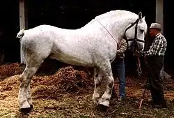 The Boulonnais, also known as the "White Marble Horse",[1] is a draft horse breed. It is known for its large but elegant appearance and is usually gray, although chestnut and black are also allowed by the French breed registry. Originally there were several sub-types, but they were crossbred until only one is seen today. The breed's origins trace to a period before the Crusades and, during the 17th century, Spanish Barb, Arabian, and Andalusian blood were added to create the modern type.