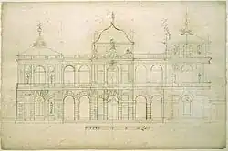 The palace was built between 1639 and 1642 by Lorenzo de Sent for Crown Grand Chancellor Jerzy Ossoliński in Mannerist style. It was built on the plan of an elongated rectangle with two hexagonal towers at garden side of the building.[1] The palace was adorned with sculptures – an allegory of Poland above the main portal, four figures of kings of Poland in the niches and a statue of Minerva crowning the roof. A possible inspiration for the palace's upper pavilion and its characteristic roof was Bonifaz Wohlmut's reconstruction of Belvedere in Prague, 1557–1563.