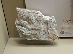 Brachychirotherium is an ichnogenus, a form taxon based on footprints. It is a type of chirothere ('hand beast'), a term referring to the footprints of five-toed Triassic reptiles with a short fifth digit, leaving an appearance similar to a reverse human hand print. Brachychirotherium was first characterized from fossils found in Triassic beds in Germany,[1] but has since been found in France,[2] South Africa,[3] Argentina, Greenland,[4] Peru,[5] Bolivia,[6][7] and North America.[8]