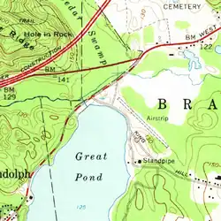 The Braintree Airport was a single dirt landing strip located in Braintree, Massachusetts. The facility was registered with the Massachusetts Aeronautics Commission, originally as a private landing field.[4] Approval to build the airport was sought by Victor H. Heurlin Jr., a Braintree native and World War II veteran who had been trained to fly while in the military. After his service commitment, he returned to Braintree and stayed in the Air National Guard. Along with other aviation enthusiasts, Heurlin formed the Braintree Airport Association in May 1948 and found a suitable parcel of land, owned by the Braintree Water Commission, near the Great Pond. As the town believed that the presence of an airfield would facilitate economic growth, it agreed to lease the land to the association. Subsequently, the association constructed a 1,200-foot-long (370 m) runway that, by 1959, had been extended to 1,400 feet (430 m).[2]