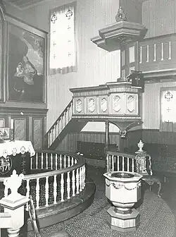 The original altarpiece was performed at that time by Eilert Balle Lund (1815–1891).[7] The present altarpiece dates to 1972 and was completed by Knut Skinnarland (1909–1993).[8] The baptismal font is in brass and dates from 1638. The organ was installed in 1913. The church has two bells dating from 1850 and 1989.[5]