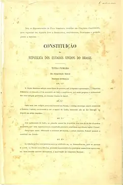 The Brazilian Constitution of 1891 (Portuguese: Constituição brasileira de 1891), also known Constitution of the Republic of the United States of Brazil (Constituição da República dos Estados Unidos do Brasil), promulgated on February 24, 1891, was the country's second constitution and the first of the republican period. The form of government became the Federative Republic, composed of twenty states (previously called provinces), and the Federal District (the city of Rio de Janeiro).[1][2]