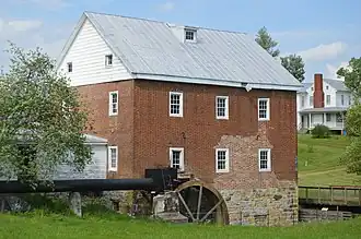 Breneman-Turner Mill is a historic grist mill located near Harrisonburg in Rockingham County, Virginia. It was built on Linville Creek about 1800 by Abraham Breneman, and is a 2 1/2-story, Federal style brick building. The building retains its water wheel, measuring 16 feet in diameter and 5 feet wide, and three sets of burr stones. The mill survived General Philip Sheridan’s burning of the Shenandoah Valley in 1864; neighbors helped put out fires set to the mill.[3]