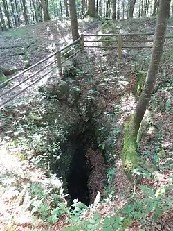 Brezovica pri Borovnici is the site of a mass grave associated with the Second World War. The Krim Cave Mass Grave (Slovene: Grobišče Krimska jama) lies in the woods south of the settlement. It contains the remains of an unknown number of Slovene civilians from neighboring villages murdered by a battalion of the Partisan Krim Detachment in 1942.[9] Some sources estimate the number of victims to be around 300.[10] The cave was used during the war by the Partisan Ljubo Šercer Battalion[11] to dispose of other victims liquidated by the Partisans.[12] It was investigated by Home Guard forces on 9 September 1942, and again with a journalist and a photographer on 23 March 1945, confirming the presence of human remains in the cave.[13][14] After the war, the entrance to the cave was dynamited in 1947, and again in September 1948.[13]
