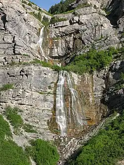 Bridal Veil Falls is a 607-foot-tall (185 m) double cataract waterfall in the south end of Provo Canyon, close to US189 in Utah, United States. Battle Creek Falls is on a nearby mountain side, approximately 10 miles north of Bridal Veil Falls.