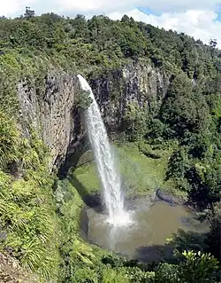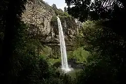 Bridal Veil Falls (officially Wairēinga / Bridal Veil Falls; Māori: Wairēinga) is a plunge waterfall located along the Pakoka River in the Waikato area of New Zealand. The waterfall is 55 m (180 ft) high, and has over time caused the formation of a large pool at the base of the waterfall. The falls are in the 217 ha (540 acres)[1] Wairēinga Scenic Reserve (created in 1884)[2] with tawa-dominated forest.[1]