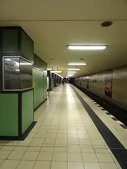 Britz-Süd is a Berlin U-Bahn station located on the U7. It was opened in 1963 and constructed by W.Düttmann. Characteristics are the grey tiles on the walls. Until 2003 this station only had a southern entrance. In 2003 the northern entrance was opened due to BVG safety policies. The station is only 3,5m below the street. The next station is Johannisthaler Chaussee.[1]