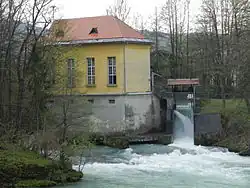 A wooden bridge was built across the Sava north of Brod in 1844, eliminating its function as a ford. The bridge was destroyed during high waters in 1907 and replaced by an iron bridge in 1910.[1][3] Ignacij Česenj established a hydroelectric plant in Brod in 1908, which provided employment for part of the local population. Brod had only 16 houses before the Second World War, and it grew rapidly after the war. During the twentieth century many small crafts developed in Brod, including furniture-making, cooperage, automobile bodywork, electrical installation, galvanizing, stove-making, and other activities. Brod was connected to Ljubljana's water mains in 1963.[3] Brod was annexed by the village of Šentvid in 1961, ending its existence as an independent settlement. Šentvid itself was annexed by the city of Ljubljana in 1974.[6][7]