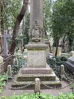 He died in Roydon near Portsmouth in 1862 in an accident at his home.[6][8] While supervising the lopping of some large trees on his property, a heavy branch snapped and fell from height, hitting his head.[8] Local doctors attended the house but he was diagnosed with a fractured skull and died a day later on 6 November 1862.[8] He is buried on the western side of Highgate Cemetery.[9][10]
