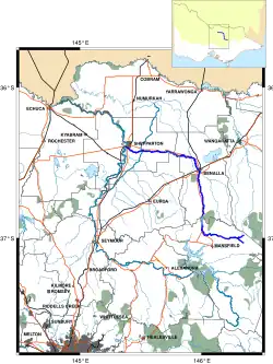 The river rises below Bald Hill on the western slopes of the Victorian Alps, within the Shire of Mansfield. The river flow generally west, then north, then west passing through or adjacent to the regional cities of Benalla and Shepparton–Mooroopna, joined by ten minor tributaries, before reaching its confluence with the Goulburn River within Shepparton. The river descends 1,070 metres (3,510 ft) over its 225-kilometre (140 mi) course.[1]