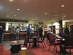 The club is split into three areas—an amphitheatre-shaped 400 capacity concert area to the left of the entrance doors, with a bar area and games room (which occasionally holds gigs) and second, 400 capacity square-shaped concert area, the Community Room, to the right.[6][21][22][3] The bar "retains the atmosphere of [a] working men's club",[6] offering "comfortable" chairs, Sky television, a pool table and dartboard.[6][23] The venue serves cask ales alongside speciality beers from around the world, and works with local companies, such as Kirkstall Brewery, to sell beer at competitive prices.[6][2][4] In March 2017 the Brudenell announced plans to build a single storey extension; including extra space for gigs and community groups to meet; and a new toilet block with disabled access.[24] This extension, named the Community Room, opened on 6 September 2017, hosting a performance from Waxahatchee.[25] An official opening took place the following day when Mogwai played a show to support the release of their ninth studio album, Every Country's Sun.[22]