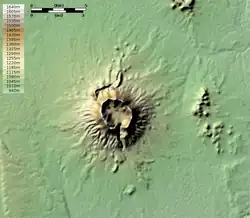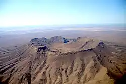 Brukkaros Mountain (Khoekhoe: Geitsi Gubib) is a collapsed caldera in the ǁKaras Region, Namibia. Measuring 1,590 metres at its peak on the eastern edge of the crater, Brukkaros is located about 15 kilometres northeast of the primarily Nama town of Berseba and 100 kilometres north-northwest of Keetmanshoop.[1] It is over 650 metres taller than the surrounding area, but the crater floor is 350 m below the rim.