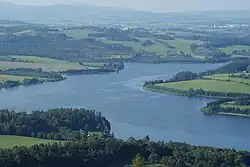 The most important rivers are the Opava, which originates here and flows through the centre of the district to the east, and the Moravice, which also originates here, flows through the southern part of the district, and later joins the Opava. An important tributary of the Opava in the district is the Opavice. The northern part of the district is drained by the Osoblaha. The Bystřice originates in the southern part of the district, but soon leaves the district. Overall, the area is poor in bodies of water, but there is Slezská Harta Reservoir, one of the largest reservoirs in the country with an area of 8.7 km2 (3.4 sq mi).