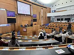 The hemicycle is on the top floor of the building, with the roof being of modern zinc and glass design. The chamber is encircled by a long curved wooden wall and there is an overhanging press and public gallery. Committee rooms have likewise been updated with modern technology but much of the building remains neoclassical. There is also a cafeteria and reading room for deputies. The four rear wings have administrative functions, including housing the President's offices. There is also 400 m2 (4,300 sq ft) of hanging gardens extending to heights of up to 27 metres (89 ft).[1]