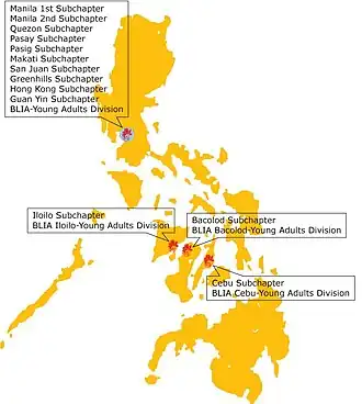 Map of the Philippines with locations of the different Chapters of BLIA Philippines