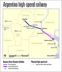 The Buenos Aires–Rosario–Córdoba high-speed railway (Spanish: Tren de Alta Velocidad de Argentina, abbreviated TAVe,[3] also named Argentine bullet train[4]) was a project designed to link the Argentine cities of Buenos Aires, Rosario and Córdoba through a 710 km (440 mi) high-speed rail network.[5]