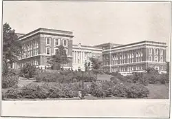 The long north and south pavilions (wings) of the original building are virtually identical. The south (Craig) pavilion was completed in 1924, but work on the parallel north (Vedder) pavilion and the Sternberg crossbar apparently continued until 1932.[2] The addition, the Siler Pavilion, was reportedly built in 1962, but appears much older. The outward-facing front elevation of each wing consists of four bays, each containing groupings of three windows, on either side of a projecting five-bay central pavilion that contains the main entrance. Within each side bay, rectangular stone panels combine the windows on the second and third floor into vertical groupings. On the east ends of the wings, double entrance doors are set within molded stone surrounds and brick pilasters with stone pedestals and caps frame the windows on the second and third floors.
