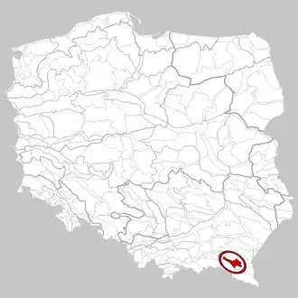 The Pogórze Bukowskie (also Bukowskie Upland, Bukowsko Upland, Bukowskie Piedmont, Bukowskie Plateau, Bukowskie Foothills) is one of the Beskids mountain ranges of the Outer Eastern Carpathians in southeastern Poland, part of the Central Beskidian Piedmont.[1] Is a hilly region in Poland (Sanok County and Podkarpacie), between Beskid Niski and Bieszczady near the river Osława and San. Its name comes from the west Slavic dialect word buk, meaning "beech".