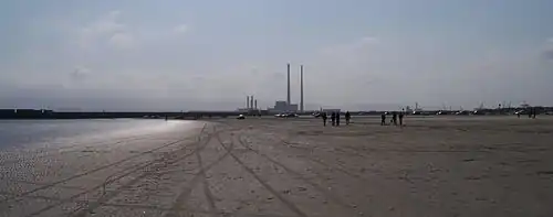 Looking along Dollymount Strand to the SW. The chimneys of the Poolbeg Generating Station are visible in the distance.